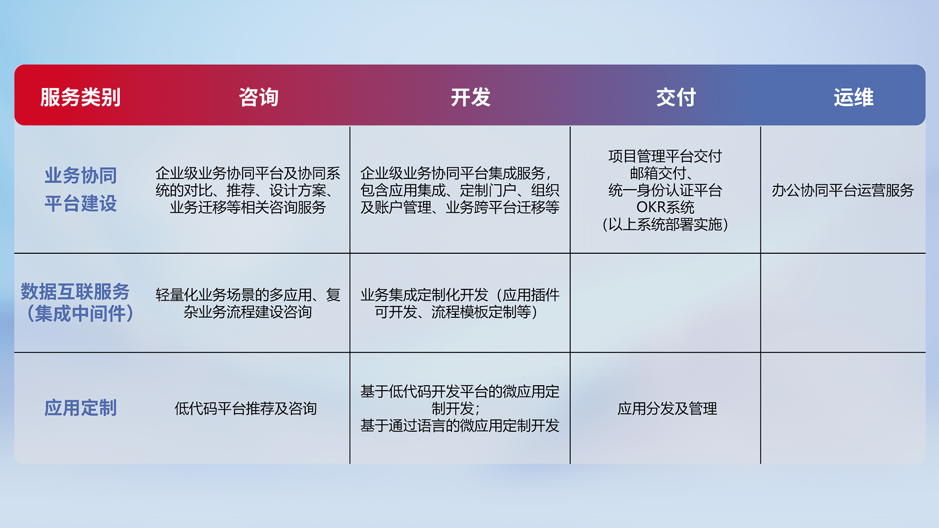 针对钉钉、、、、企微、、IDaas等平台级产品提供产品的规划、、方案、、交付、、、、定制化开发等服务,,,,实现如统一协同办公、、智能客户服务、、、、混合会议管理、、、、智能数据查询、、、、等业务场景,,实现数字化转型。。。
